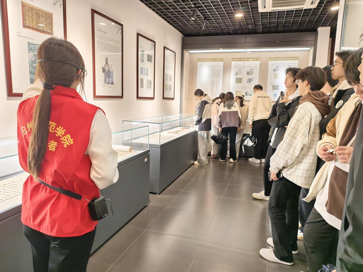 在讲解员的带领下,同学们秩序井然地参观了汉字起源、青铜文明、名家名作三大主题展馆。从承载先民智慧的甲骨文等早期文字载体,到见证汉字演变的古制钱币、刻石等文物,一件件展品清晰勾勒出汉字发展脉络,让同学们深切感受中国汉字文化的源远流长与博大精深。学校保存的活字印刷术资料及展馆展示的相关器具,更激起了大家对传统文化的浓厚兴趣,同学们或驻足细观,或低声交流,不时用手机记录下珍贵的展品与知识要点,深切体会着沧州师范学院深厚的历史文化底蕴,对博大精深的中国汉字文化有了更为鲜活和深刻的新认识。