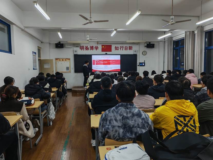 团课开始,主持人让同学们全体起立共唱团歌,以此激发同学们心中的责任意识。第一部分,主持人解读了“时代与读书的共振关系”,结合当前中华民族伟大复兴关键时期的背景,强调青年通过读书提升自我、服务国家的重要性,并分享了习近平总书记关于青年成长、读书学习的重要论述,让同学们深刻认识到读书不仅是个人成长的需要,更是时代赋予的责任与使命。第二部分,他们聚焦“读书的多重价值”,从认知、思维、品格、动力四个维度,剖析读书对开阔眼界、锤炼思辨能力、涵养正气、明确人生方向的作用,还列举周恩来“为中华之崛起而读书”的榜样故事,激发同学们的阅读热情;第三部分提出“新时代青年责任清单”,引导同学们从对自身、家庭、学校、国家四个层面梳理责任,明确“小我”成长与“大我”发展的辩证统一;第四部分,他们围绕“读书与实践的转化路径”,建议同学们制定读书计划、每日留存阅读时光,鼓励大家通过参与志愿服务等方式,将书本知识转化为实际担当。最后,主持人号召全体同学以读书践行担当,用知识和能力托举强国梦想。