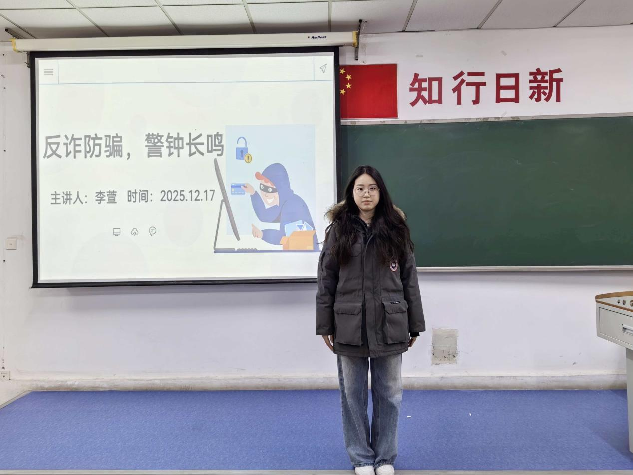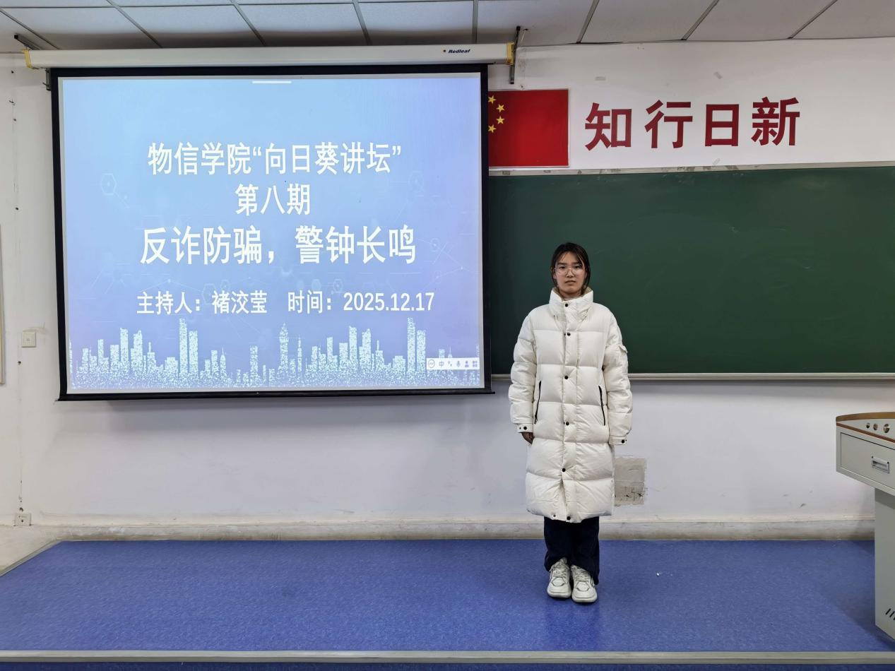 为引导同学们树立反诈防骗意识,掌握反诈辨别技巧,增强同学们的自我保护意识与能力,物理与信息工程学院于2025年12月17日晚上7:30,在理科楼二楼第八阶梯教室举行“反诈防骗,警钟长鸣”向日葵讲坛第八期,主持人为褚洨莹,主讲人为李萱,参加人员为物理与信息工程学院2025级部分学生。