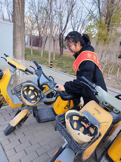 活动中,志愿者们先集合签到并领取绶带和志愿服,随后按划定区域分组行动,将乱停的共享单车扶正摆齐、归位至指定停车点,同时清理车辆周边杂物。志愿者们严格恪守“知、情、意、行相统一”原则,全程认真负责,以自身安全为前提落实各项任务,遵守交通规则,不随意散漫、不擅自离开。