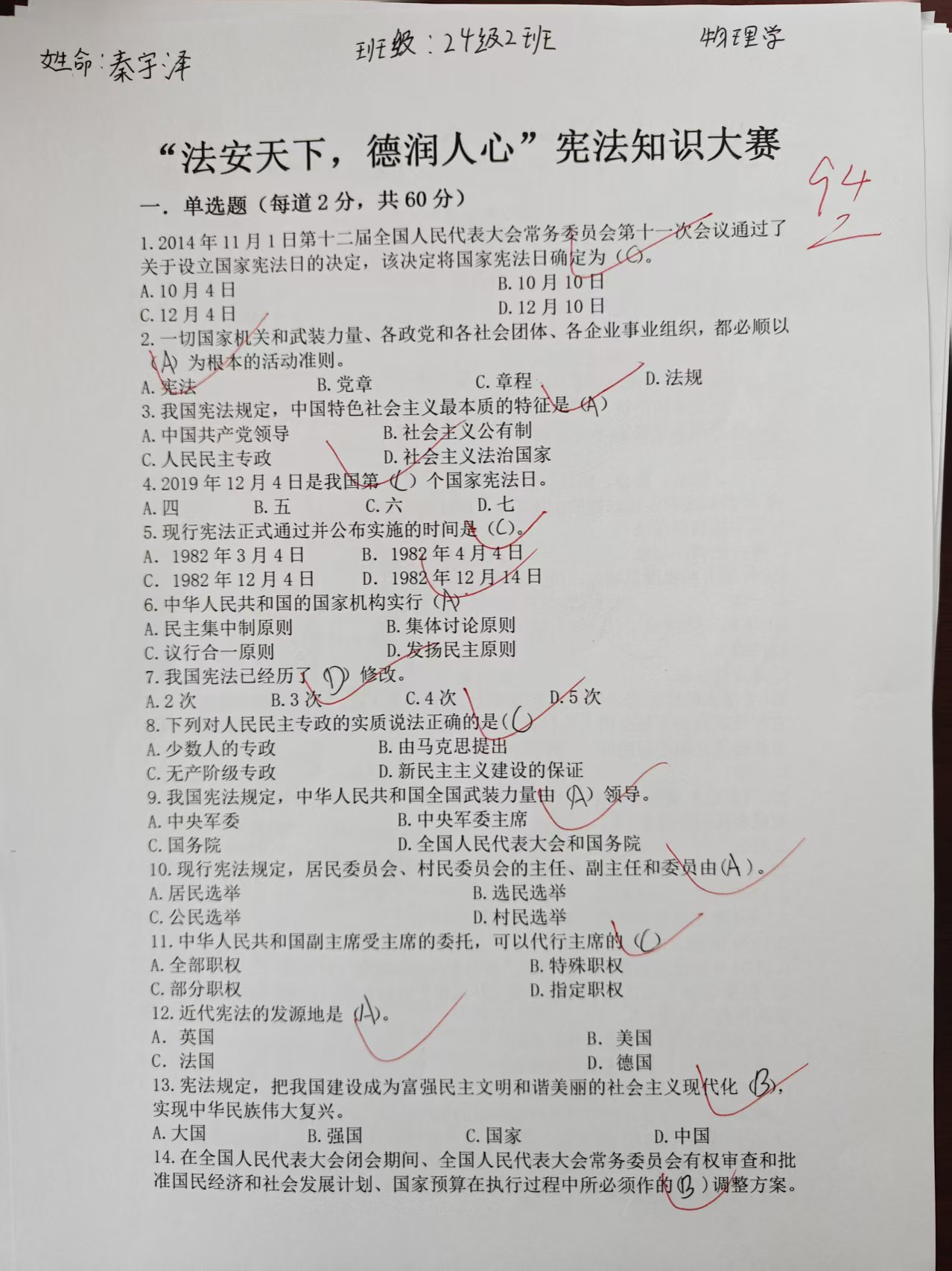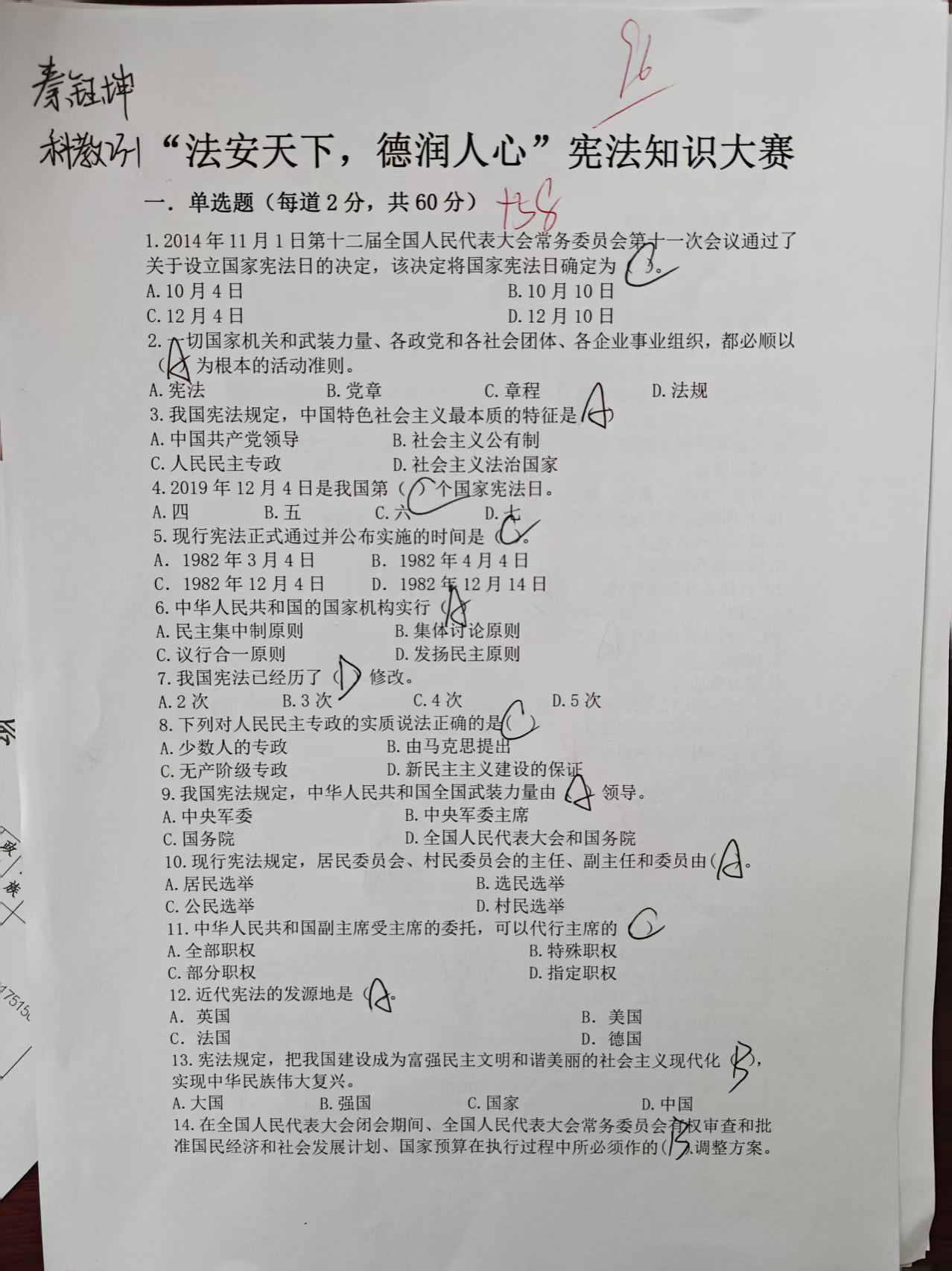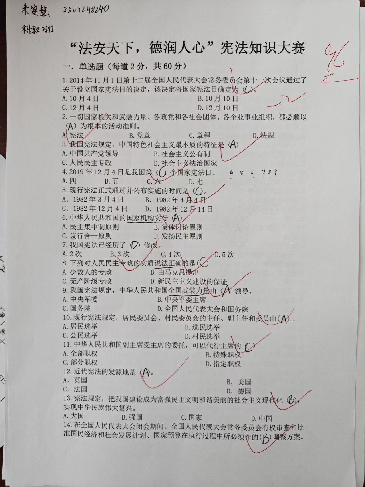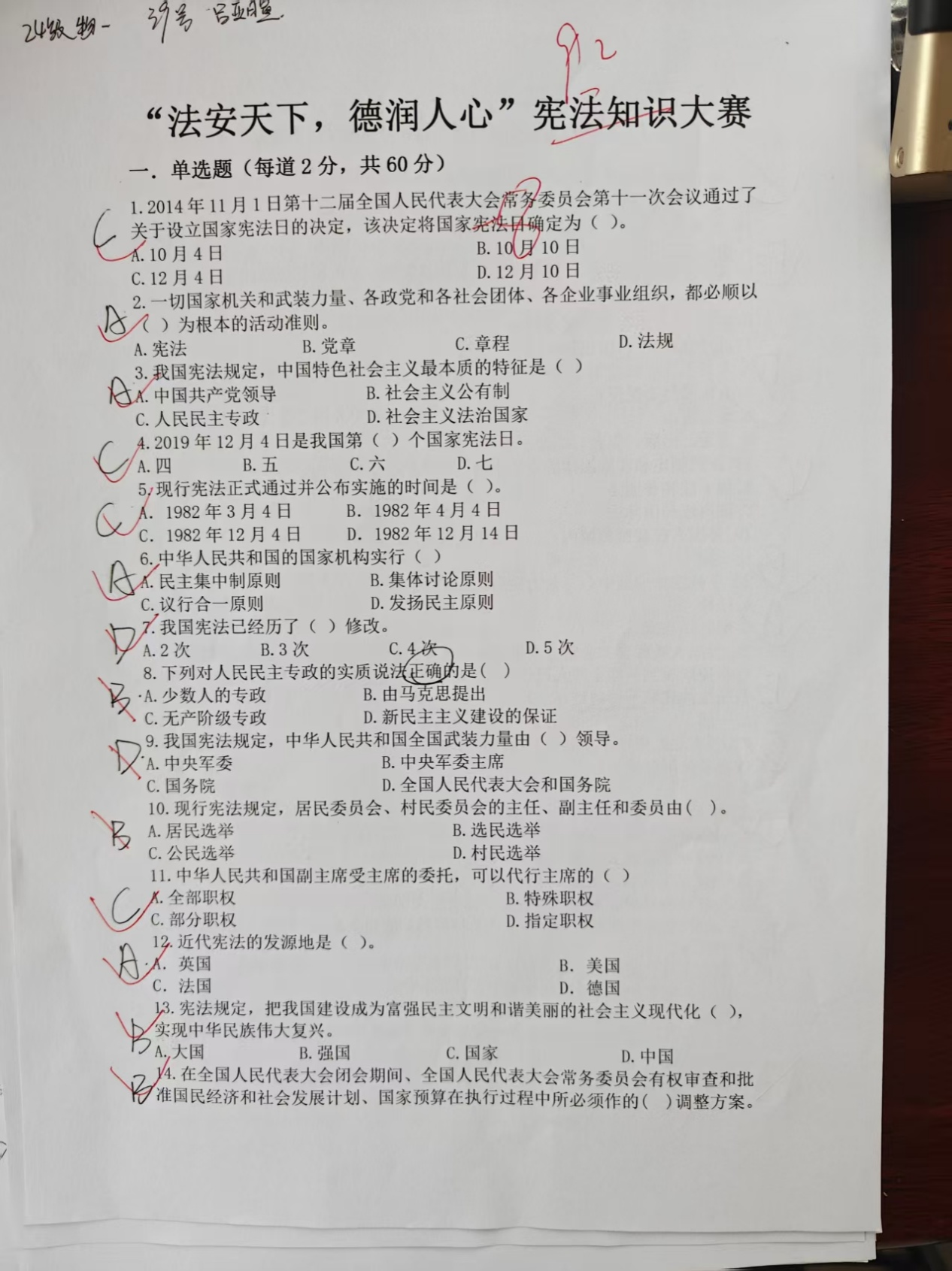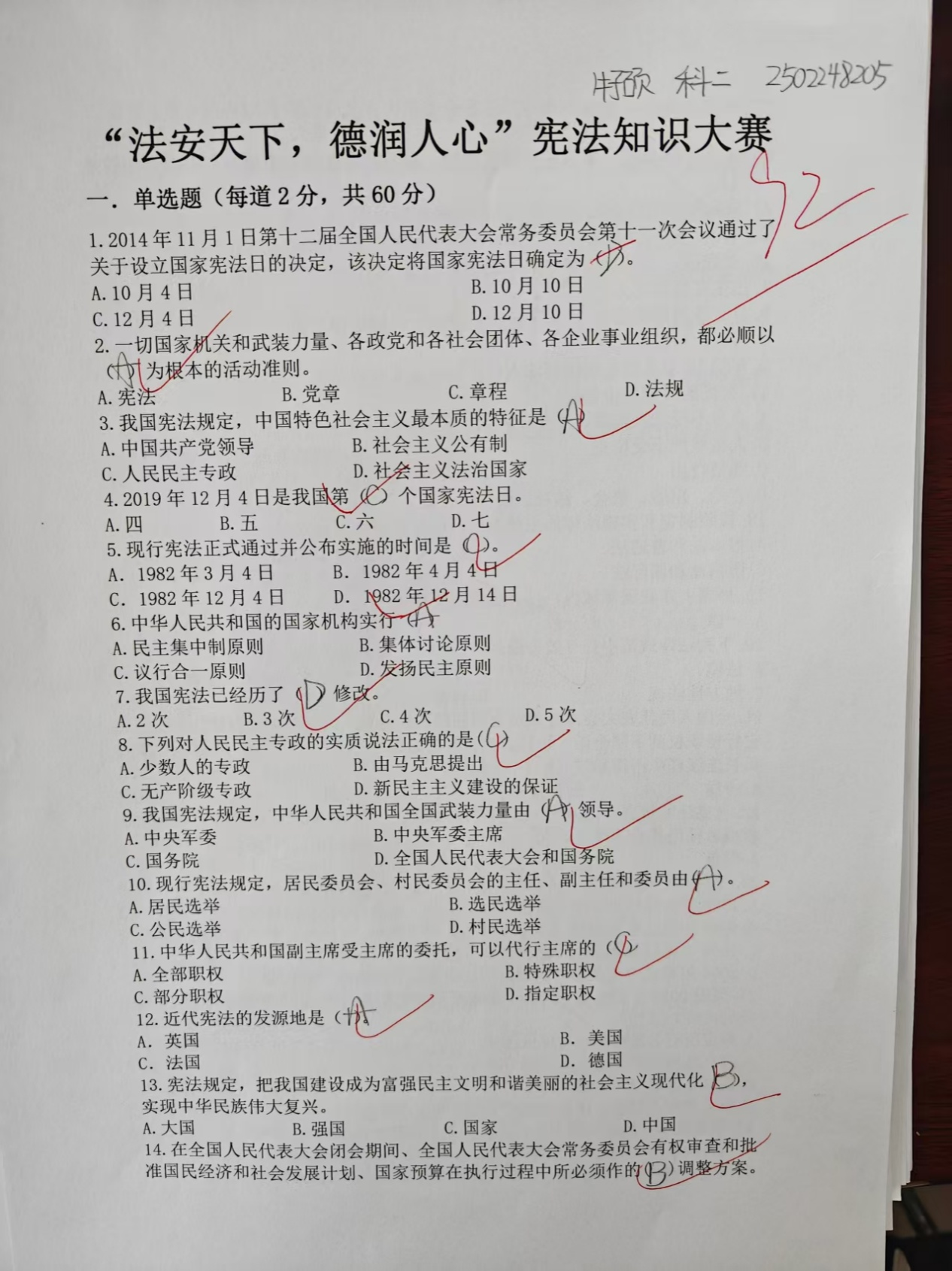 本次宪法知识竞赛不仅是知识储备的比拼,更是对同学们法治素养与学习态度的集中检验。参赛同学始终保持专注严谨的态度,坐姿端正、凝神思考,落笔时审慎斟酌,以认真务实的作风践行竞赛规则,用实际行动展现对宪法知识的敬畏与求知热忱。这份全情投入的态度,让竞赛成为传递法治精神的生动载体,也让每一位参与者在沉浸式作答中深化了对宪法的理解与认同。