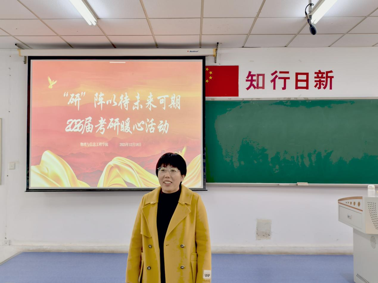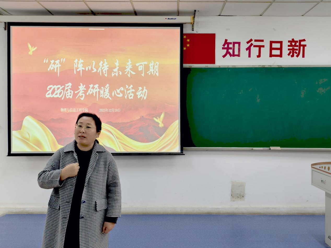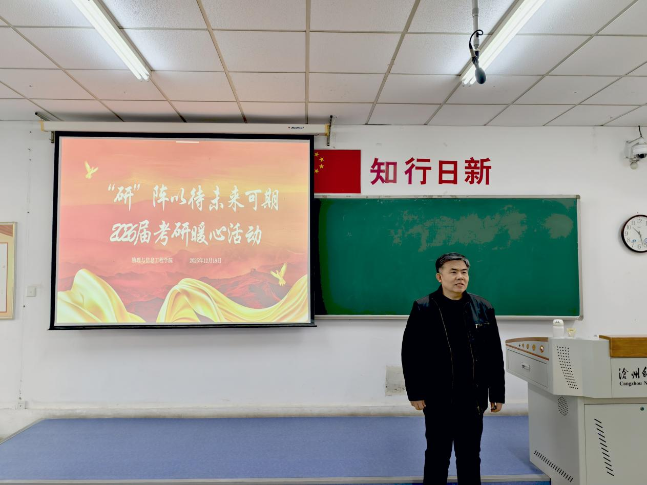 为了在考研冲刺阶段为学子们鼓舞斗志、传递关怀,进一步凝聚信心,物理与信息工程学院于2025年12月18日上午10:20在理科楼二楼第八阶梯教室举办“‘研’阵以待,未来可期”2026届考研暖心活动。主持人为2022级辅导员魏圣男,参加人员为党总支书记迟建文、党总支副书记马坤、院长黄晓寸、副院长李燕、副院长刘娜以及2022级部分考研学子。