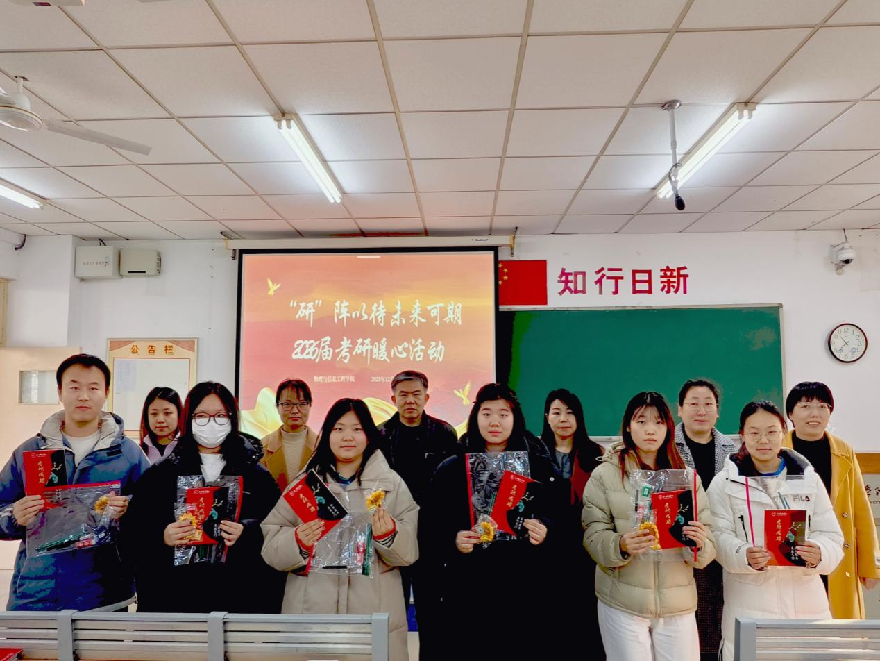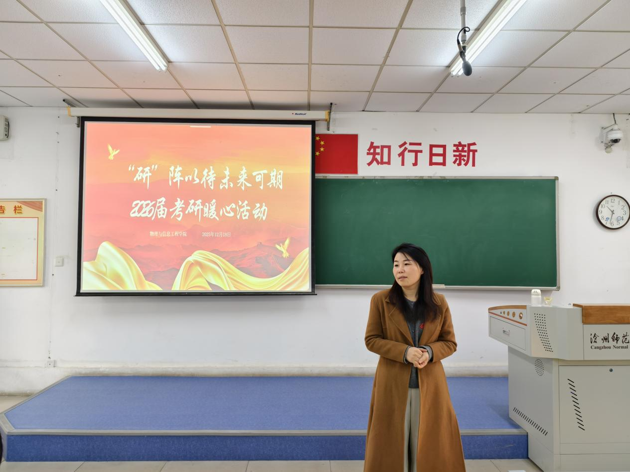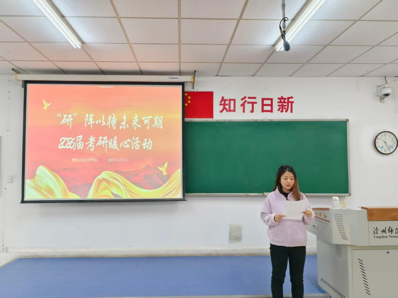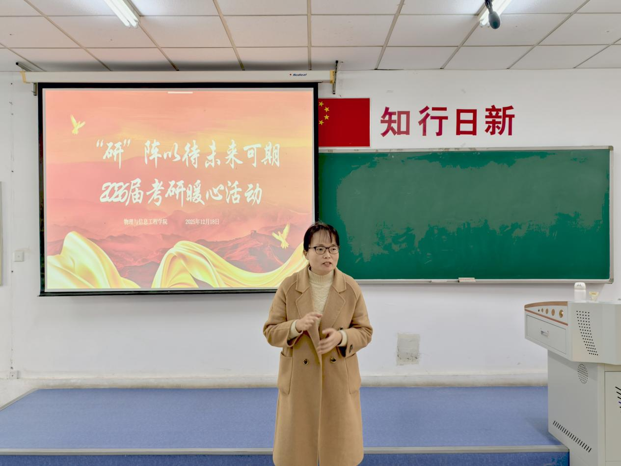 为了在考研冲刺阶段为学子们鼓舞斗志、传递关怀,进一步凝聚信心,物理与信息工程学院于2025年12月18日上午10:20在理科楼二楼第八阶梯教室举办“‘研’阵以待,未来可期”2026届考研暖心活动。主持人为2022级辅导员魏圣男,参加人员为党总支书记迟建文、党总支副书记马坤、院长黄晓寸、副院长李燕、副院长刘娜以及2022级部分考研学子。