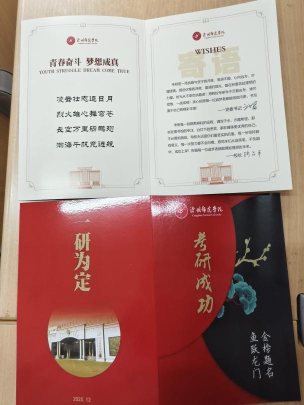 考研之路,是青春里一次难忘的征程,也是一段为理想全力以赴、不负韶华的炽热奔赴。愿所有考研学子承载学院的深切关怀与老师的殷切嘱托,以初心为帆,以坚持为桨,在最后的冲刺中奋勇争先,在考场上挥洒厚积薄发的力量。相信2026届考研学子必将用拼搏书写无悔的答卷,用成绩回报一路艰辛,让奋斗的青春在研途征程中闪耀璀璨星光!