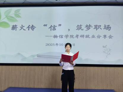 为了给学生提供全方位的考研与就业指导,帮助同学们深入了解考研报名流程、院校专业选择、就业扶持政策等关键信息,明确未来发展方向,物理与信息工程学院于2025年10月30日召开考研就业分享会。会议主持人为段文婷,参加人员为2023级全体学生。