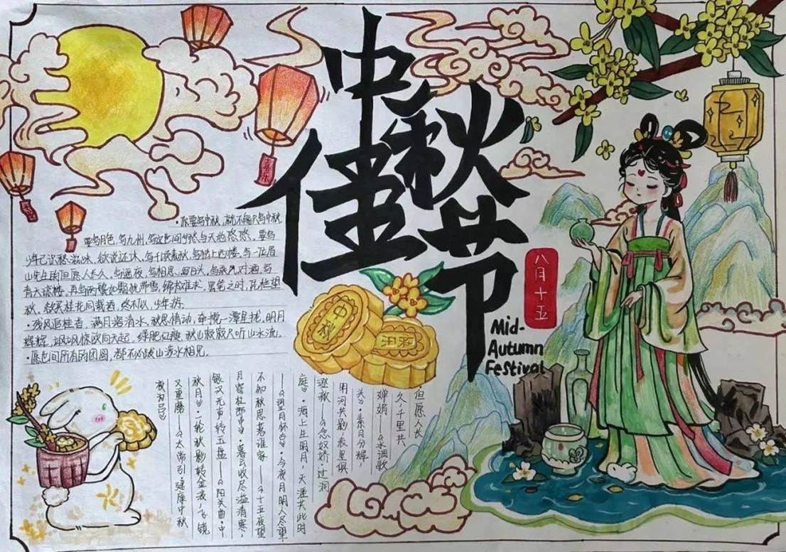 活动期间,同学们踊跃参与,以画笔为媒,以纸张为卷,将对中秋佳节的美好情思与文化理解尽情挥洒。有的同学专注于描绘中秋的经典意象,玉兔捣药、嫦娥奔月,将神话传说与节令美食融为一体,画面生动有趣;有的同学则将笔触延伸至生活,通过温馨的家庭团聚、月下赏月的场景,细腻地传递出中秋“团圆”的核心情感;还有同学深入挖掘中秋的文化底蕴,不仅介绍了节日的起源与各地习俗,还引用了经典的中秋诗词,使作品兼具美感与文化深度。每一份手抄报都凝聚着同学们的巧思与匠心,展现了新时代青年对传统文化的热爱与传承。